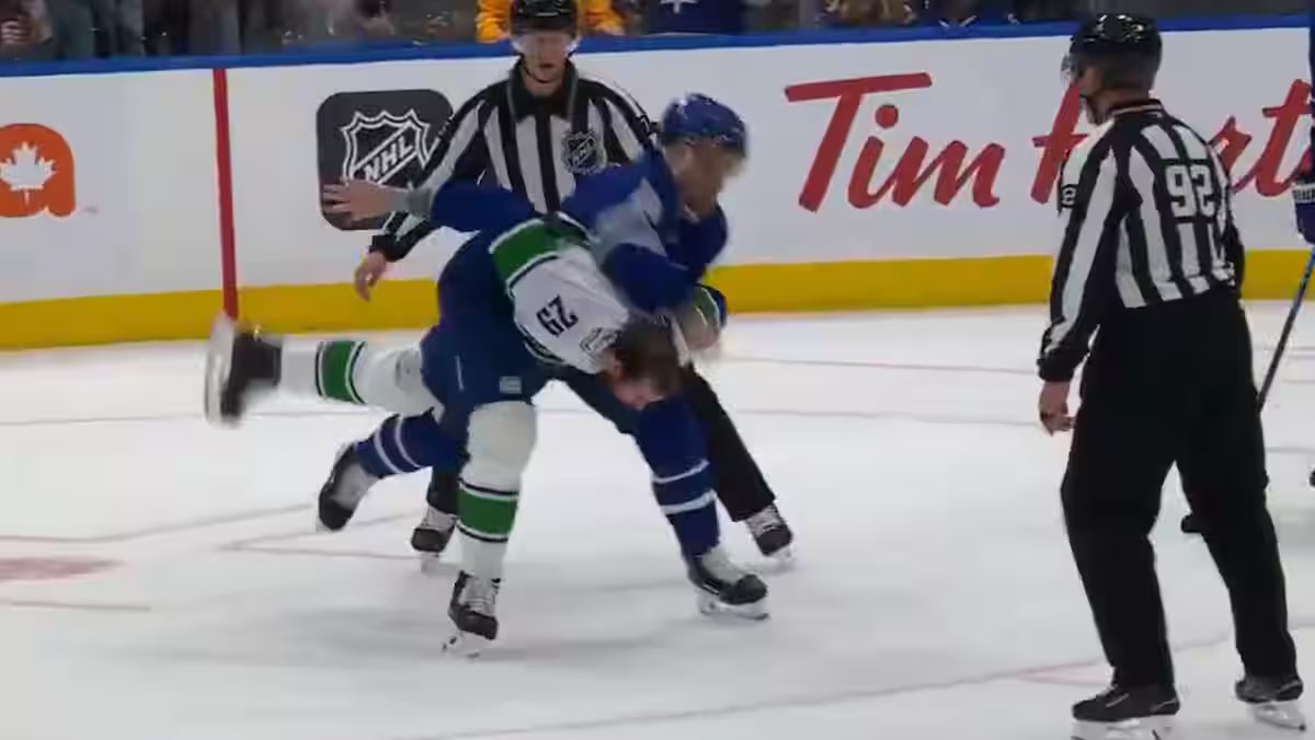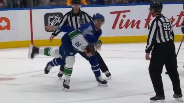 En el segundo período, los Maple Leafs de Toronto se enfrentaron 4 a 0 a los Canucks de Vancouver y estos últimos tuvieron la intención de provocar que cualquiera de ellos eligiera. Pettersson, un defensor de 6 pi 5 po, piensa que es fácil contra Domi.