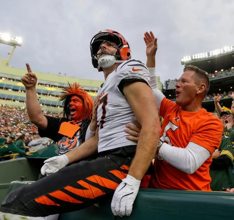 El ala cerrada de los Cincinnati Bengals, Tanner Hudson (87), salta a las gradas para celebrar con los fanáticos después de anotar un landing contra los Inexperienced Bay Packers el domingo 12 de octubre de 2025, en Lambeau Area en Inexperienced Bay, Wisconsin. Los Packers ganaron el juego, 27-18. Tork Mason/USA TODAY NETWORK-Wisconsin