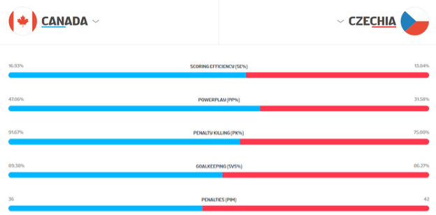 Canadá ha marcado 32 goles, la mayor cantidad en el torneo y cinco más que Suecia, que ocupa el segundo lugar. El juego de poder ha producido ocho goles y está funcionando con más del 47 por ciento de eficiencia, también en lo más alto del evento. Desde una perspectiva de cara a cara, los cinco principales países que más sacan empates de Canadá están operando con una tasa de éxito del 59 por ciento frente al 57 por ciento de Chequia.