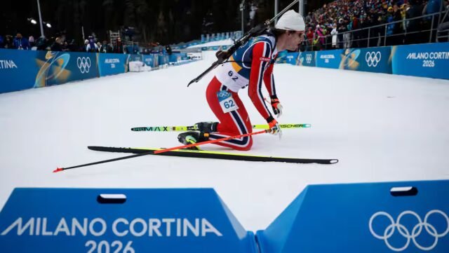 Un atleta noruego tiene confianza para los menos improvisados en la televisión nacional celebrando la medalla de bronce en biatlón, martes, en los juegos de invierno en Italia.