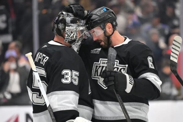 5 de enero de 2026; Los Ángeles, California, Estados Unidos; El portero de los Angeles Kings, Darcy Kuemper (35), es felicitado por el defensa Joel Edmundson (6) después del partido contra el Minnesota Wild en Crypto.com Area. Crédito obligatorio: Jayne Kamin-Oncea-Imagn Photographs