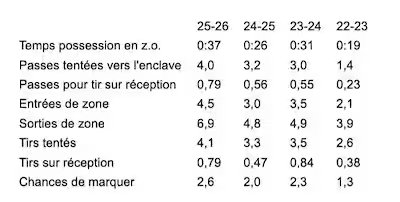 En zona adversa, todas las estadísticas también progresaron en este año. Por ejemplo, se mantiene una cantidad mínima de 2,6 posibilidades de marcar por partido cuando se sitúa en 2,0 la temporada pasada. Il tente plus de passs dans l’enclave et plus de passs pour des tirs sur réception. Mais surtout, il décoche plus de lancers.