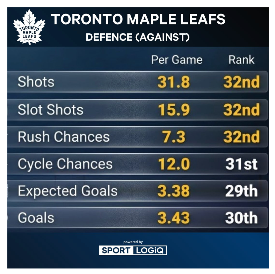 La última vez que los Leafs se quedaron sin ganar en una serie de cinco juegos en casa fue hace más de 40 años, desde el 29 de diciembre de 1984 hasta el 9 de enero de 1985. Esta vez, fueron superados 25-12 en el proceso, lo que demuestra claramente que no están hechos para estar con equipos legítimos de playoffs y se han establecido como el peor equipo defensivo de la NHL.