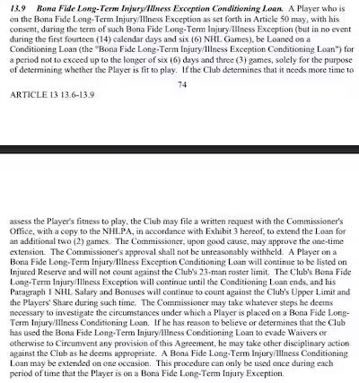Este artículo estipula que un joueur qui était à l’infirmerie puede beneficiarse de un séjour especial prévu pour les blessés à lengthy terme (Préstamo condicionado de excepción de buena fe para lesiones o enfermedades a largo plazo). Dans ces tendencies, Laine peut être envoyé à Laval, s’il y consent, sans compter dans la formación de 23 joueurs du Canadien, mais solo pour une limite de six jours et trois matchs. Una prolongación de esta duración puede ser negada con la LNH.