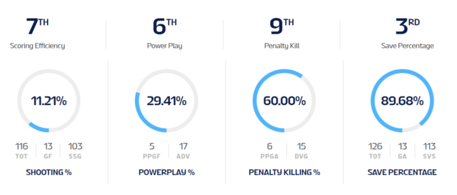 Kirsch ha registrado un promedio de 1.01 goles en contra y un porcentaje de salvamento de .950 en sus dos aperturas, mientras que Neuenschwander ha contribuido con un promedio de 2.51 goles en contra / porcentaje de salvamento de .902.