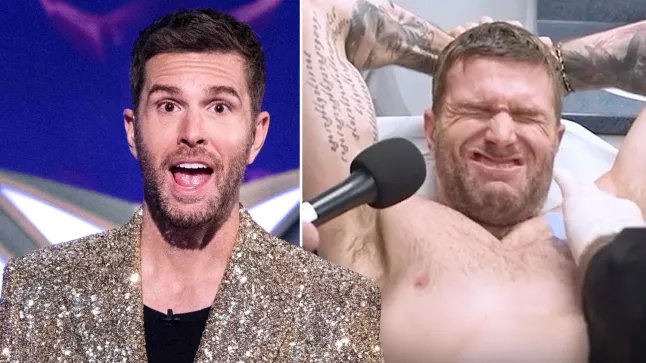 El presentador de Masked Singer UK, Joel Dommett, hizo una mueca de dolor después de perder una apuesta con su amigo Ben Shephard y verse obligado a hacerse un piercing en el pezón.