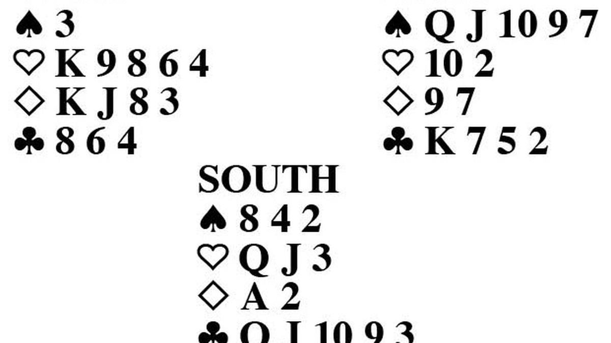 Sur jugó chico desde el muerto en la salida de corazón y capturó el 10 de Este con la dama. Jugó el as y otro diamante contra el rey de Oeste, y Oeste cambió a un trébol, ganó con el as del muerto mientras Este jugaba una carta alentadora. Sur cobró la dama de diamantes, decepcionado porque el palo no se dividió 3-3, y jugó un diamante a Oeste. Este completó una buena imagen de su mano descartando un trébol chico y la dama de espadas. Oeste salió con una espada y el declarante no pudo hacer más de ocho bazas, perdiendo una.