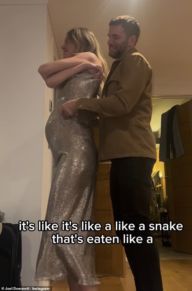 La esposa de Joel Dommett, Hannah, mostró su panza mientras luchaba por quitarse el vestido en un video divertido compartido en Instagram el sábado.