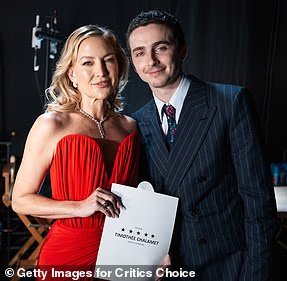 Timothee Chalamet ganó el premio al mejor actor por Marty Supreme mientras posa con Kate Hudson