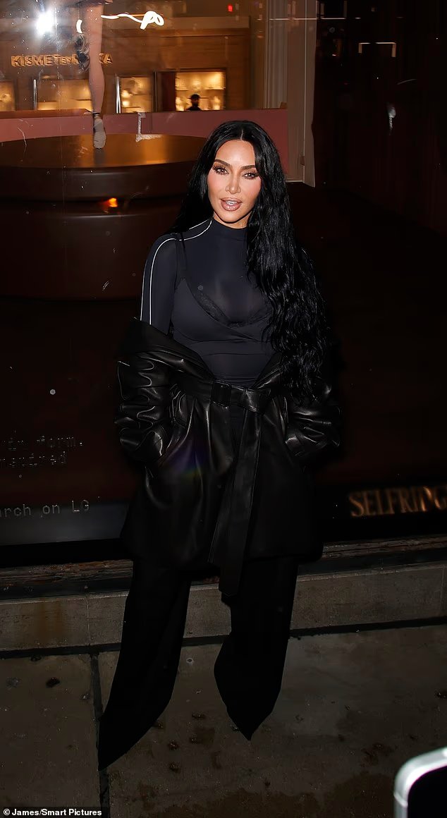 Kim lució una gabardina de cuero sobre un high azul marino ceñido que dejaba entrever un toque de lencería.