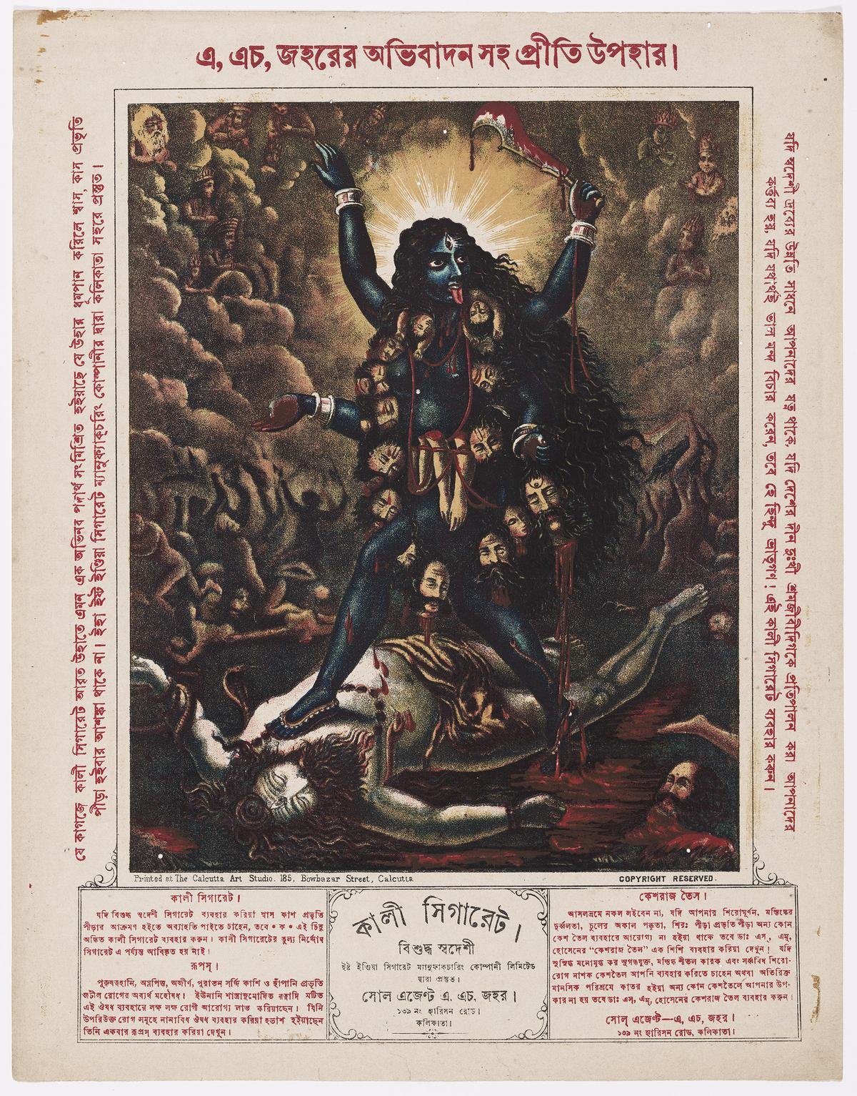 En el Museo de Bellas Artes de Boston, este vívido cartel de Kali está rodeado de una masacre y un texto delicadamente representado en rojo sangre. A los lados, alaba a la Diosa como protectora, instando a los devotos a adorar su imagen en busca de valentía. A continuación, hay un anuncio de cigarrillos Kali, orgullosamente declarados como “swadeshi puro”. (Y, en el optimismo fuera de lugar típico de la época, también “confiable, confiable y seguro para fumar”.)