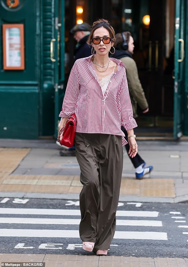 Para la salida, Myleene vistió una camisa a rayas rojas y blancas, que combinó con pantalones holgados y tacones de plataforma rosas.