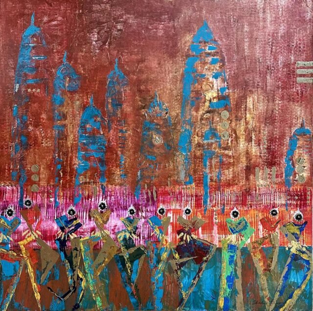 De Bhubaneshwar, la serie de la artista Helen Brahma, Penari Ulung (La bailarina trascendental), explora su relación entre textil y cultura. El centro de su trabajo es el tejido Sambalpuri, que envuelve a los bailarines Odissi. “Los motivos ikat utilizados en todo el cuerpo de los bailarines son íntimos de mis raíces culturales”, cube Helen. Los retratos encarnan lo divino femenino, pero también están inspirados en los movimientos de Ramli que la han conmovido profundamente. De manera comparable, otro artista de Chennai, AV Ilango, ha utilizado acrílico sobre lienzo para resaltar los movimientos sutiles y la gracia de la forma de danza. La paleta está repleta de colores de la India: amarillo mango, caléndula, rojo chile, púrpura actual, azul pavo actual, esmeralda y verde loro que abrazan los atuendos de los bailarines.
