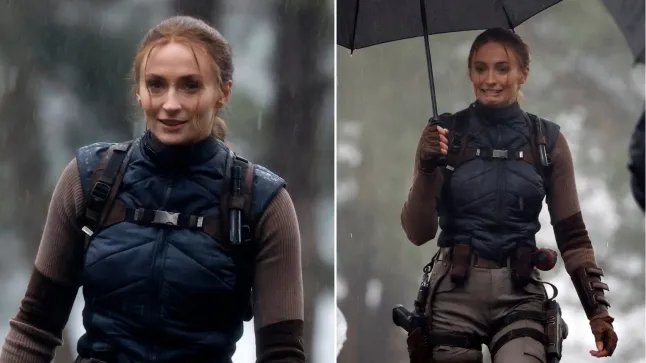 Sophie Turner ha sido vista en acción como Lara Croft por primera vez mientras desafiaba la lluvia torrencial y el frío mientras realizaba sus propias acrobacias durante el rodaje.
