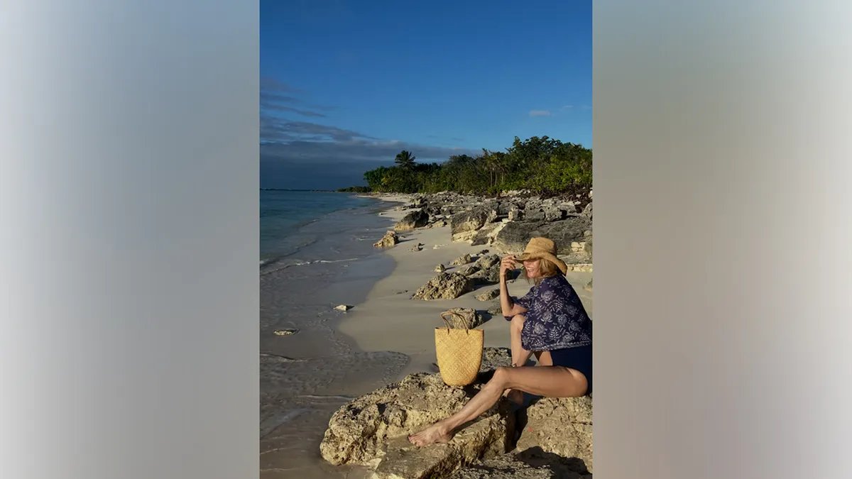 La ex modelo de trajes de baño de Sports activities Illustrated, de 71 años, sonrió mientras miraba el agua, sosteniendo su sombrero de paja mientras un bolso tejido a juego descansaba a su lado, con sus largas piernas extendidas a lo largo de la costa rocosa.
