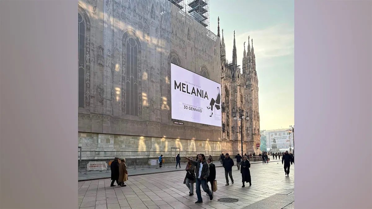 La campaña publicitaria de la película ‘MELANIA’ en el lateral del Duomo de Florencia, Italia.