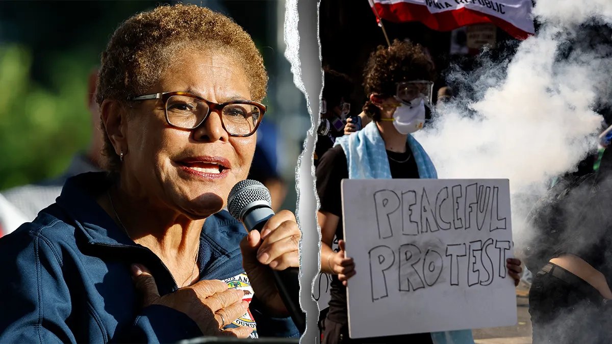 Karen Bass minimizó el alcance de las protestas contra ICE del año pasado que provocaron disturbios y enfrentamientos violentos con las autoridades. (Imágenes falsas)