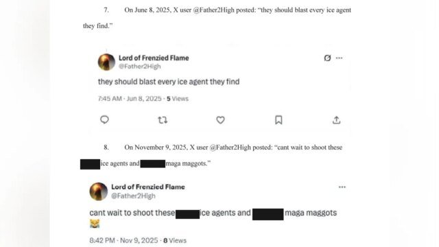 Los fiscales dicen que la misma cuenta publicó más tarde otro mensaje el 9 de noviembre de 2025, que decía: “No puedo esperar para dispararles a estos p—agentes del hielo y a los gusanos maga r——d”.
