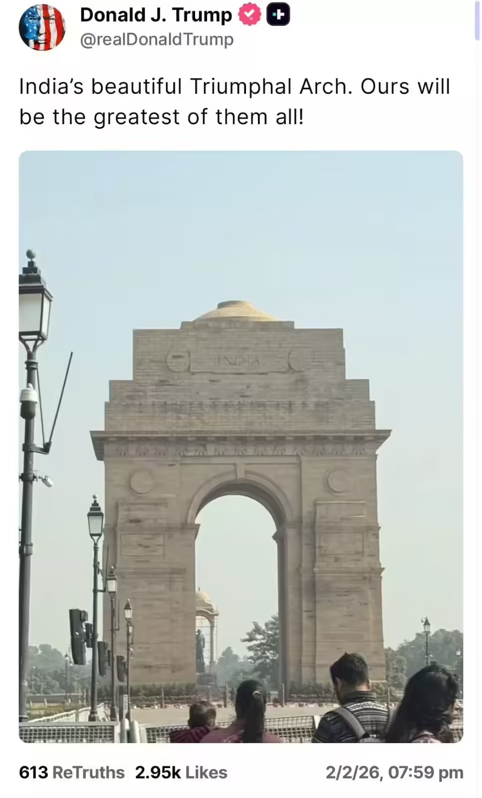 El presidente de Estados Unidos, Donald Trump, compartió el lunes una fotografía de la icónica Puerta de la India de Nueva Delhi en su plataforma de redes sociales, Reality Social, al tiempo que reiteró su visión de construir un enorme arco triunfal en Washington DC.Al publicar la imagen, Trump escribió: “El hermoso Arco de Triunfo de la India. ¡El nuestro será el más grande de todos!”. La publicación se produjo en medio de su renovado impulso por lo que describió como un “Arco de la Independencia” en la capital de Estados Unidos.