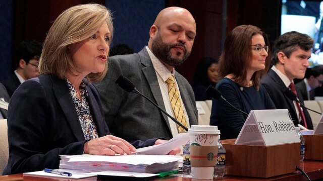 La representante estatal de Minnesota, Kristin Robbins (izquierda), pronuncia un discurso de apertura mientras testifica junto, de izquierda a derecha, con los representantes estatales de Minnesota Walter Hudson y Marion Rarick y el ex asesor especial del Departamento de Justicia, Brendan Ballou, durante una audiencia ante el Comité de Supervisión y Reforma Gubernamental de la Cámara de Representantes sobre el escándalo de fraude de Minnesota. (Chip Somodevilla/Getty Photographs)
