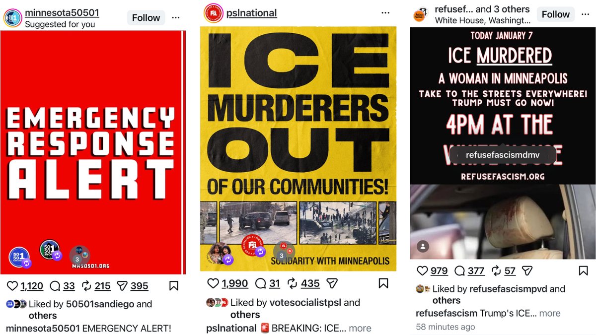 Una crimson de organizaciones publicó publicaciones anti-ICE en las redes sociales el miércoles, inmediatamente después del tiroteo contra un manifestante, quien supuestamente intentó atropellar a agentes de ICE. (Minnesota 50501/@minnesota50501, Partido por el Socialismo y la Liberación/@PSLNational, Rechazar el Fascismo/@RefuseFascism)