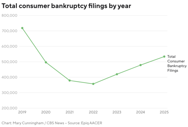 El complete de solicitudes de quiebra de consumidores aumentó un 12%, de 478.752 en 2024 a 533.949 en 2025, según Epiq AACER, una plataforma que proporciona datos sobre declaraciones de quiebra en Estados Unidos. Epiq, que rastrea las presentaciones del Capítulo 7, Capítulo 11 y Capítulo 13, se basa en datos proporcionados a través del sistema PACER de los tribunales estadounidenses, una base de datos electrónica que alberga registros de los tribunales federales.