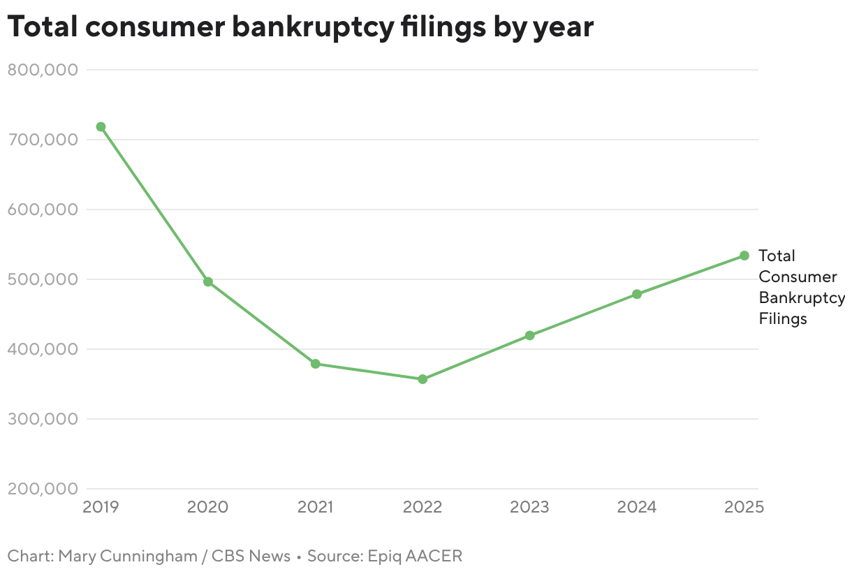 El aumento en las solicitudes se produce en un momento en que los consumidores y las empresas estadounidenses enfrentan una serie de presiones económicas, que van desde una inflación persistente hasta costos de endeudamiento elevados, dijeron expertos a CBS Information.