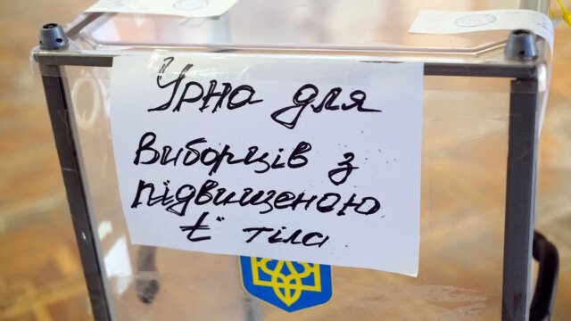 Una nota marca una urna para votantes con alta temperatura en un colegio electoral durante las elecciones locales ucranianas de 2020 en Rubizhne, región de Luhansk, este de Ucrania, el 25 de octubre de 2020, en medio de la pandemia de coronavirus. (Kovalyov Oleksiy/Ukrinform/Future Publishing vía Getty Pictures)