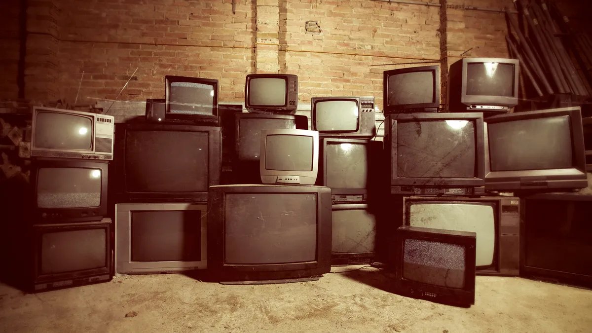 Una pila de muchos televisores CRT de tubo antiguos en un entorno que parece un almacén.