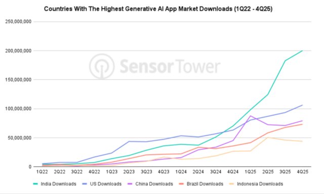 India se convirtió en el mercado más grande del mundo para descargas de aplicaciones de IA generativa en 2025, según la firma de inteligencia de mercado Sensor Tower, ampliando su ventaja sobre Estados Unidos a medida que las instalaciones aumentaron un 207% año tras año.