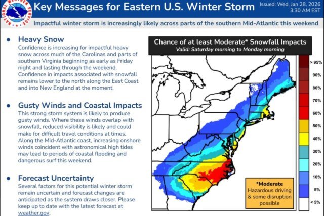 El Servicio Nacional de Meteorología liberado El mapa apareció el miércoles por la mañana temprano, indicando que la confianza ha aumentado para nevadas “impactantes”, particularmente en las Carolinas y el sur de Virginia, que comenzaron el viernes por la noche. Los estados costeros desde Georgia hasta Maine tienen al menos un 5% de probabilidad de nevadas moderadas entre el sábado y el lunes, lo que puede causar interrupciones en los viajes y exacerbar los cortes de energía persistentes debido a la tormenta del fin de semana pasado.