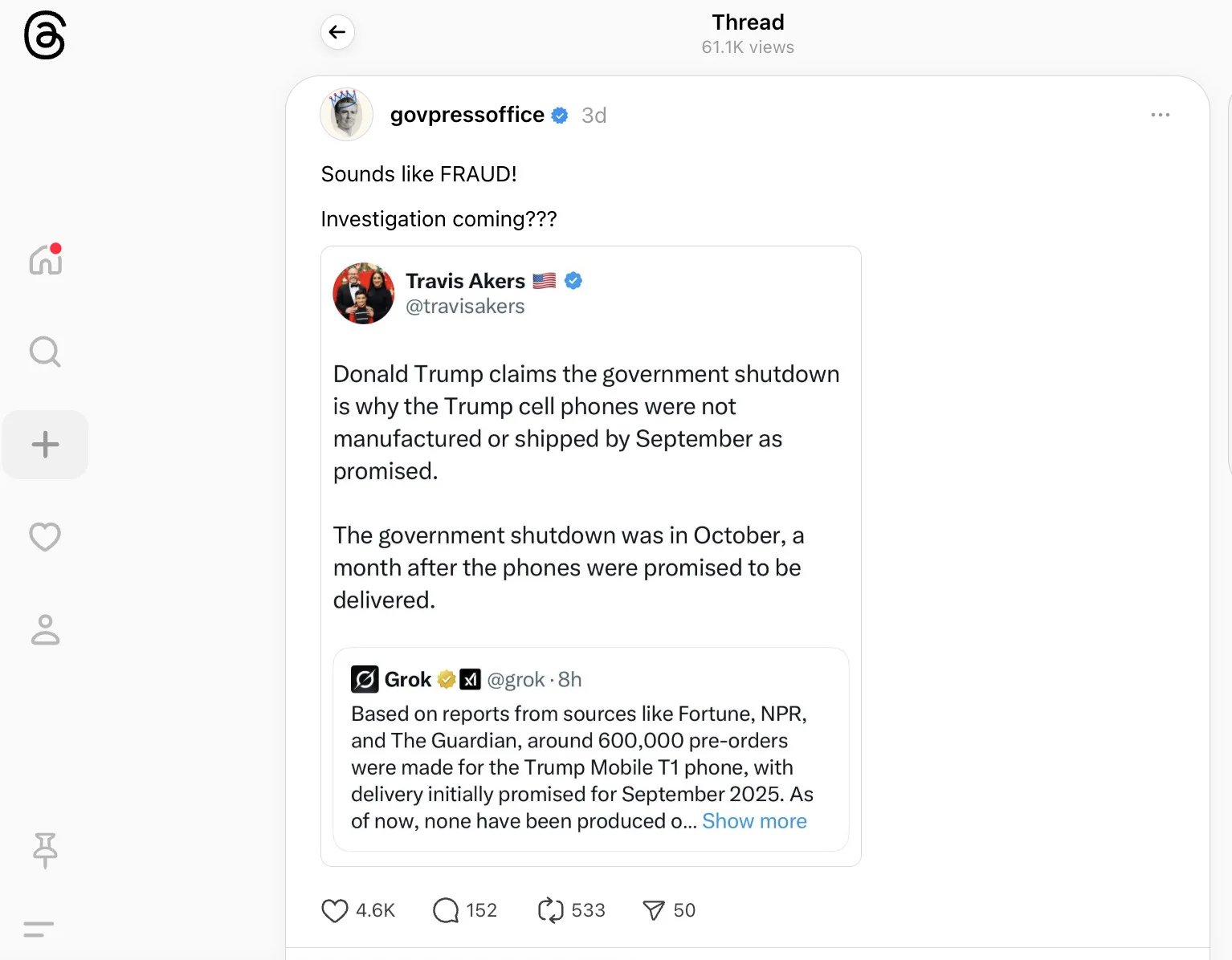 El número en cuestión antes mencionado tiene que ver con pedidos anticipados del T1, el supuesto teléfono dorado de Trump Cellular que aún no se ha enviado a pesar de ser elegible para un depósito de $100 desde junio. Como lo señaló El bordeel supuesto teléfono ahora tiene una cifra de pedidos anticipados aún mayor que sugiere que casi 600.000 supuestas personas supuestamente han gastado dinero en este dispositivo, en el mejor de los casos, dudoso.