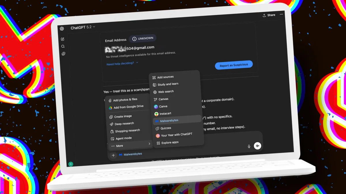 Piense en Malwarebytes como un asistente de seguridad en tiempo actual. En lugar de buscar en foros o confiar en sitios de verificación de estafas, puede realizar evaluaciones de seguridad rápidas directamente en ChatGPT. La integración proporciona veredictos sobre estafas y amenazas, con datos de ciberseguridad extraídos de la base de datos de “inteligencia sobre amenazas” continuamente actualizada de Malwarebytes.