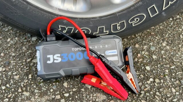 La buena noticia fue que tenía un arrancador en el maletero del coche. La unidad period una Topdón JS3000 y es una unidad de 3.000 A diseñada para arrancar motores que van desde pequeños hasta grandes: motores de gasolina de hasta 9 litros y motores diésel de hasta 7 litros. Completamente cargada, esta unidad debería ser capaz de realizar hasta 45 arranques auxiliares. Hay una luz incorporada en el frente.