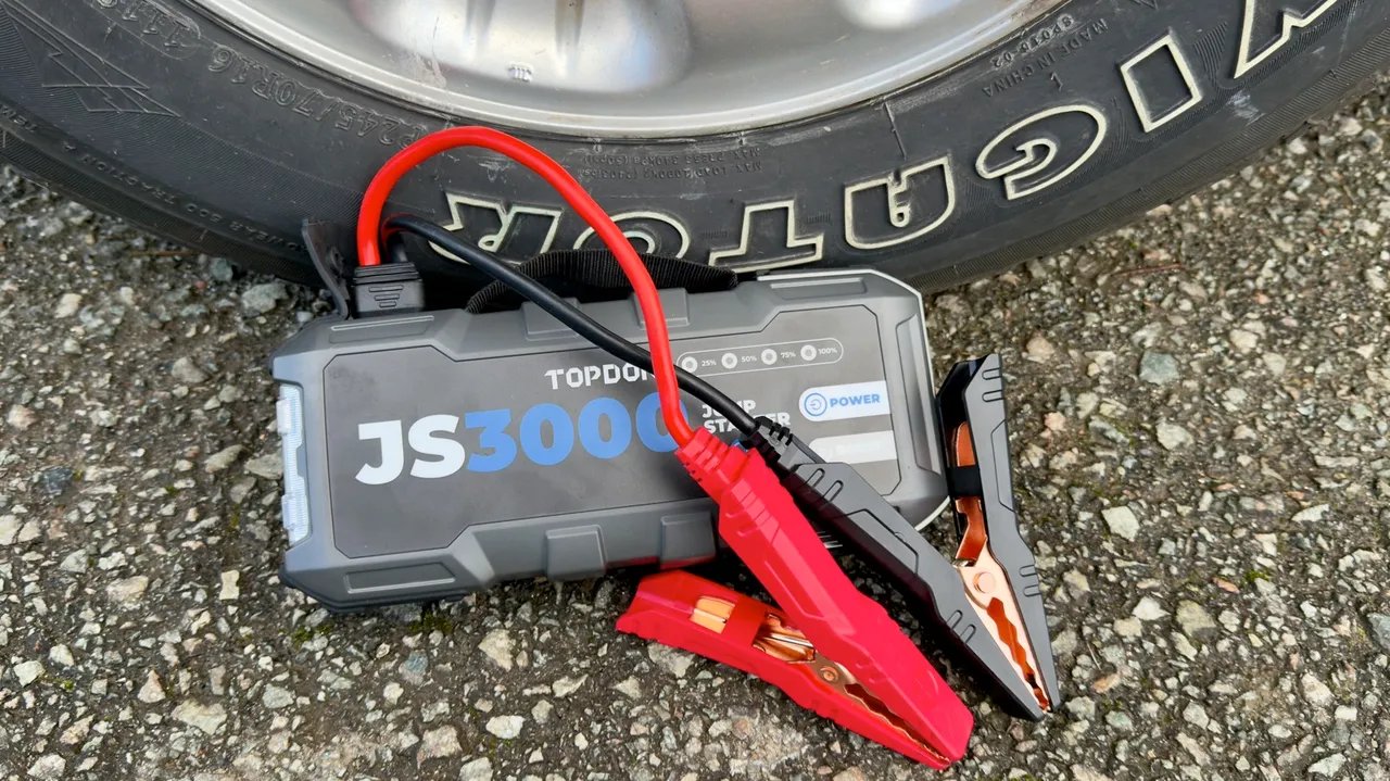 La buena noticia fue que tenía un arrancador en el maletero del coche. La unidad period una Topdón JS3000 y es una unidad de 3.000 A diseñada para arrancar motores que van desde pequeños hasta grandes: motores de gasolina de hasta 9 litros y motores diésel de hasta 7 litros. Completamente cargada, esta unidad debería ser capaz de realizar hasta 45 arranques auxiliares. Hay una luz incorporada en el frente.