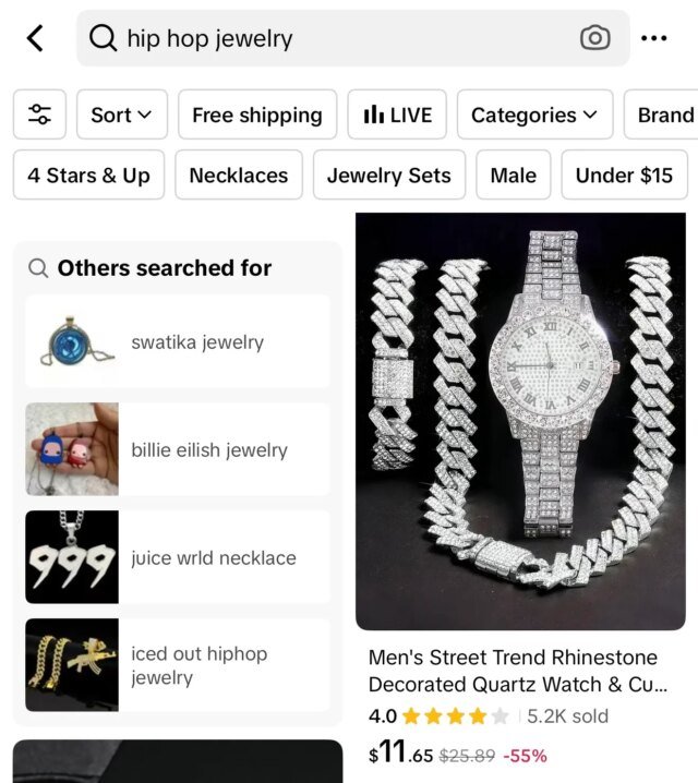 mi viaje en TikTok Store comenzó con una búsqueda de “joyas de hip hop”. Es una consulta de búsqueda inocua que probablemente varios usuarios hayan escrito con la esperanza de encontrar algo que ponerse. Mientras buscaba joyas baratas, me llamó la atención lo que el algoritmo de TikTok sugirió repetidamente que también podría interesarme: joyas con un flagrante simbolismo nazi.