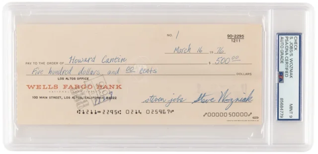 Los artículos relacionados con la historia temprana de Apple, especialmente los artículos que involucran a Jobs, han alcanzado precios estratosféricos en los últimos años. Jobs period famoso por su renuencia a firmar artículos, y su firma se considera una de las más valiosas de cualquier figura pública. Incluso una tarjeta de visita firmada puede costar hasta seis cifras. “Existe una conexión emocional entre Steve Jobs y los coleccionistas”, cube el vicepresidente ejecutivo de RR, Bobby Livingston. “A las personas que inician sus propias empresas de ingeniería o de Web les encantan los productos Apple”. Lonnie Mimms, propietario del cheque número 2 y fundador de un museo tecnológico en Roswell, Georgia, habla efusivamente del valor de esos trozos de papel. “Puedes conseguir cualquier cosa en el mundo con la firma de Steve Wozniak, pero Jobs es otra historia. Y ellos dos juntos es la mayor rareza”.