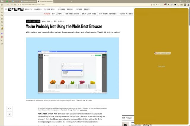Las nuevas “poderosas herramientas” de esta versión incluyen algunas mejoras en Tab Tiling, la función de Vivaldi para tener dos pestañas (dos páginas net o más) una al lado de la otra en la misma ventana. Vivaldi 7.8 agrega una nueva característica que le permite colocar pestañas en mosaico usando arrastrar y soltar. Tome cualquier pestaña en su barra de pestañas y arrástrela a la pestaña precise, y Vivaldi colocará las dos una al lado de la otra. El lugar donde lo arrastre determina cómo se organiza la pestaña en mosaico: hacia la izquierda, hacia la derecha, arriba o abajo, según dónde lo desee.