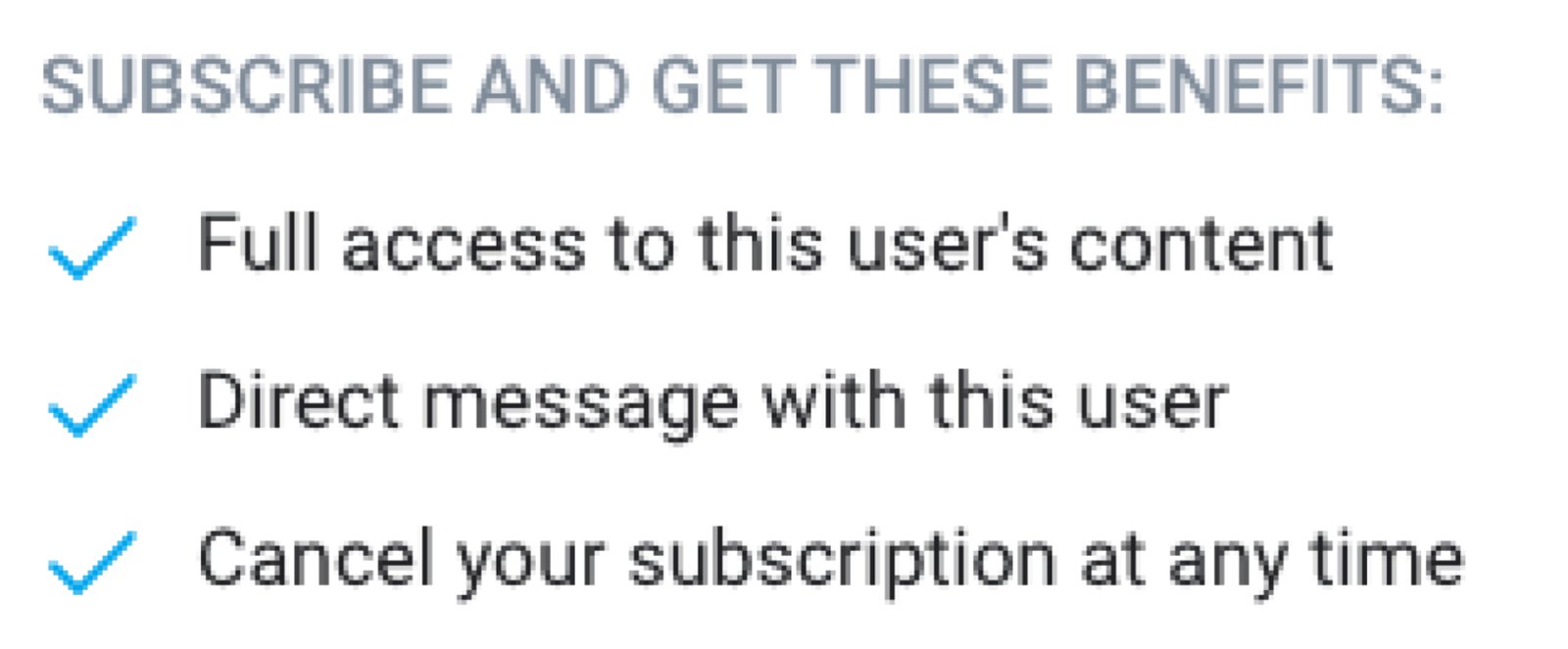 Cuando los clientes de Onlyfans hacen clic en “suscribirse” a la suscripción paga de un creador, aparecen una ventana emergente que promete “Acceso completo al contenido de este usuario” y “Mensaje directo con este usuario” (además de poder cancelar en cualquier momento). Para las suscripciones gratuitas, la página simplemente se actualiza cuando un fan hace clic en “suscribirse”.
