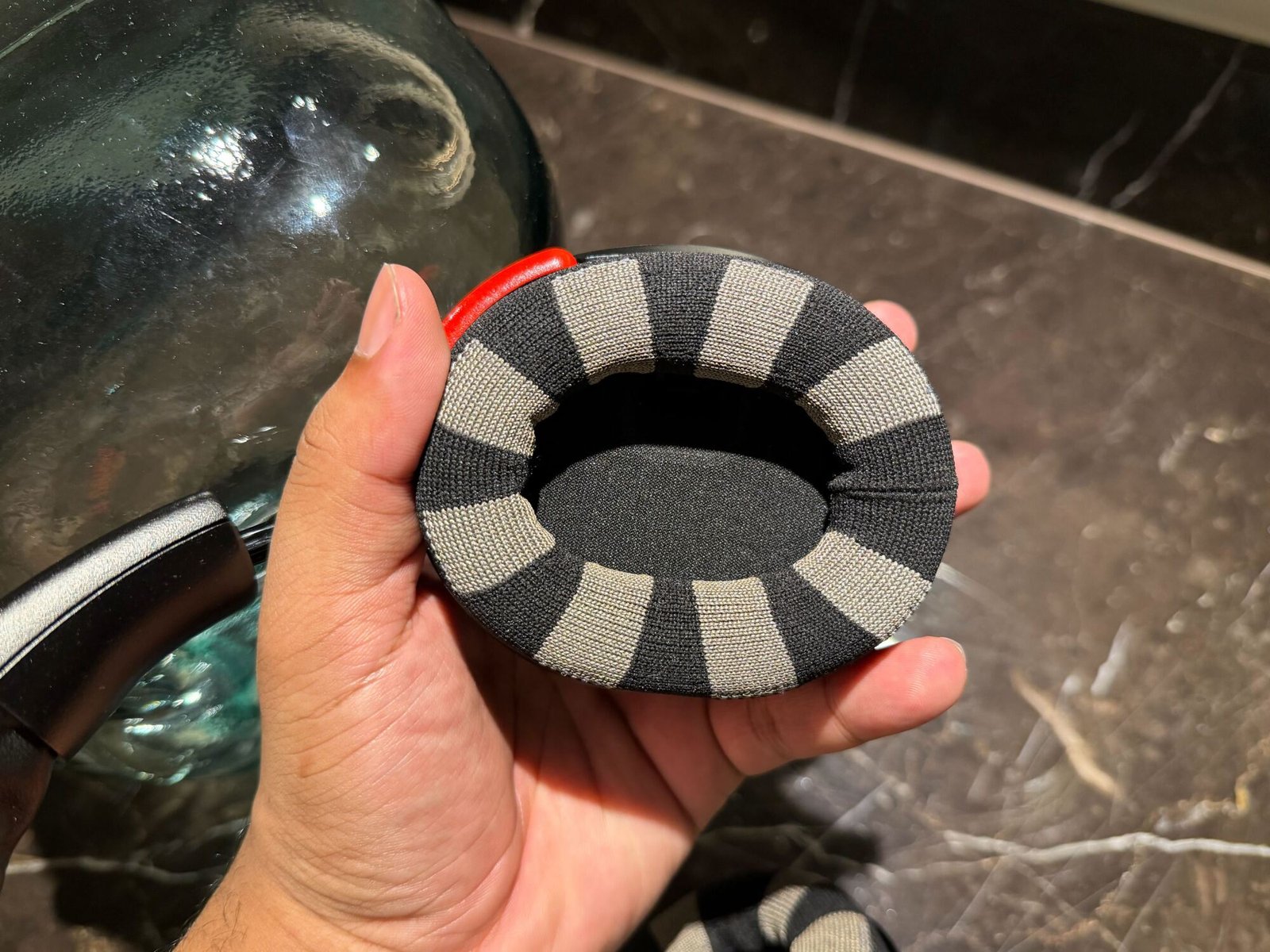 Probé los auriculares neurotecnológicos de Neurable durante una demostración privada con el equipo dentro del Palazzo, lejos del caos de la sala de exposiciones. Los auriculares cuentan con orejeras gruesas y acolchado de tela que están diseñados para ocultar sensores de EEG sin parecerse a un equipo de laboratorio.