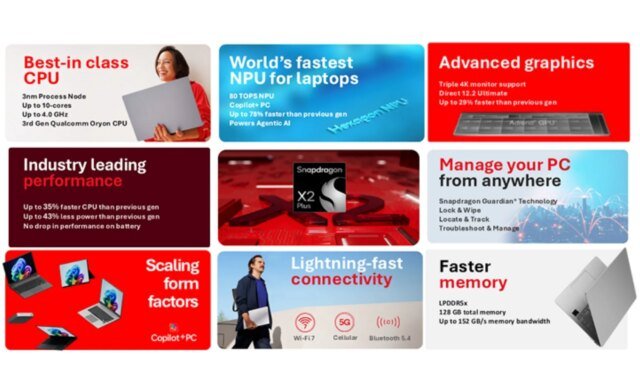 En el frente de la conectividad, incluye 5G, Wi-Fi 7 y Bluetooth v5.4 opcionales. La primera ola de computadoras portátiles con el procesador Snapdragon X2 Plus de Qualcomm llegará en los próximos meses con la insignia Copilot+. Idealmente, estas computadoras portátiles deberían ubicarse en el rango de precios de $ 800 para desafiar a la MacBook Air y la próxima computadora portátil de bajo costo de Apple con un procesador de la serie A de grado móvil.