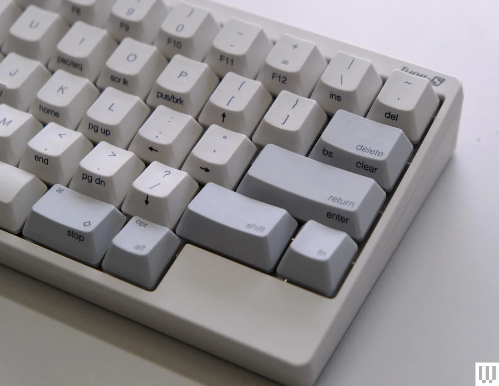 La parte más discordante del diseño probablemente será la falta de teclas en las esquinas inferiores izquierda y derecha, pero esas teclas (supuestamente) están ausentes por una razón. En teoría, es difícil alcanzar la esquina con el meñique mientras se mantiene la mano en la fila principal. En cambio, la única tecla que queda en esa fila es la tecla Alt más pequeña, a la que se puede acceder más fácilmente con el meñique o el pulgar. Si bien no estoy necesariamente de acuerdo con la opción de dejar las esquinas en blanco, vale la pena sacrificar una tecla Management a la que se pueda acceder inmediatamente, y las esquinas en blanco se han vuelto lo suficientemente icónicas con el HHKB que deshacerse de ellas sería casi una blasfemia para la comunidad que se ha desarrollado en torno a este teclado.