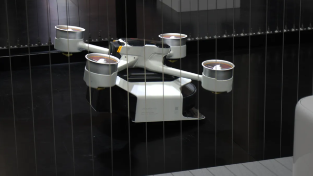 Para la demostración, todo está contenido en una caja de metallic bastante pequeña, ya que Mova y los organizadores de CES quieren que el Pilot 70 se estrelle en algún lugar del concurrido salón de exposiciones. Vi el dron despegar y flotar en el aire durante unos 30 segundos a un minuto, antes de aterrizar nuevamente. Esperaba que aterrizara en la plataforma negra que se muestra en la foto de arriba, pero por alguna razón no fue así. Mi contacto en Mova dijo que el aterrizaje estaba funcionando en demostraciones anteriores, pero que esta vez pudo haber habido un problema técnico.